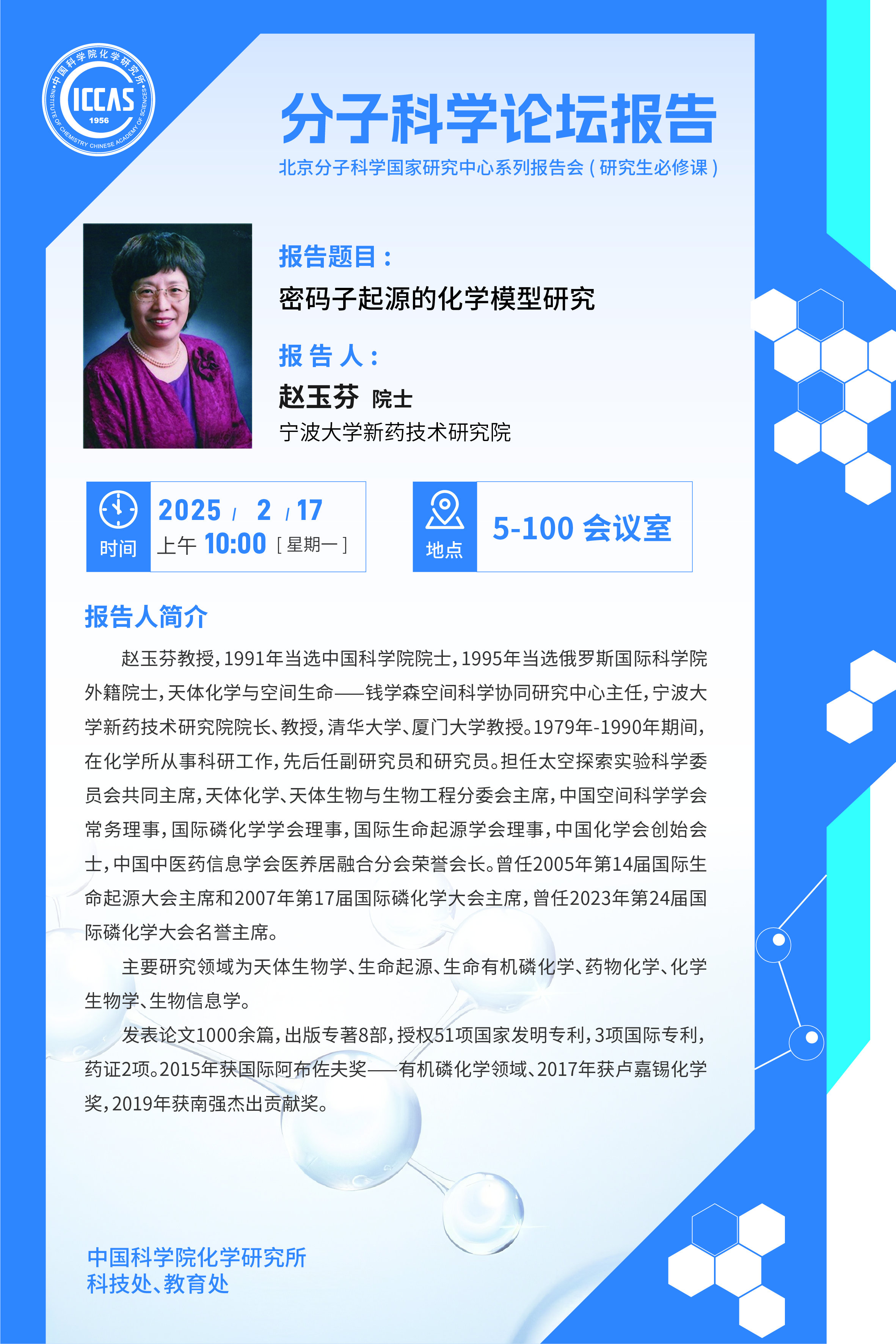 宁波大学新药技术研究院赵玉芬院士拟于2025年2月17日访问化学所并作分子科学论坛报告